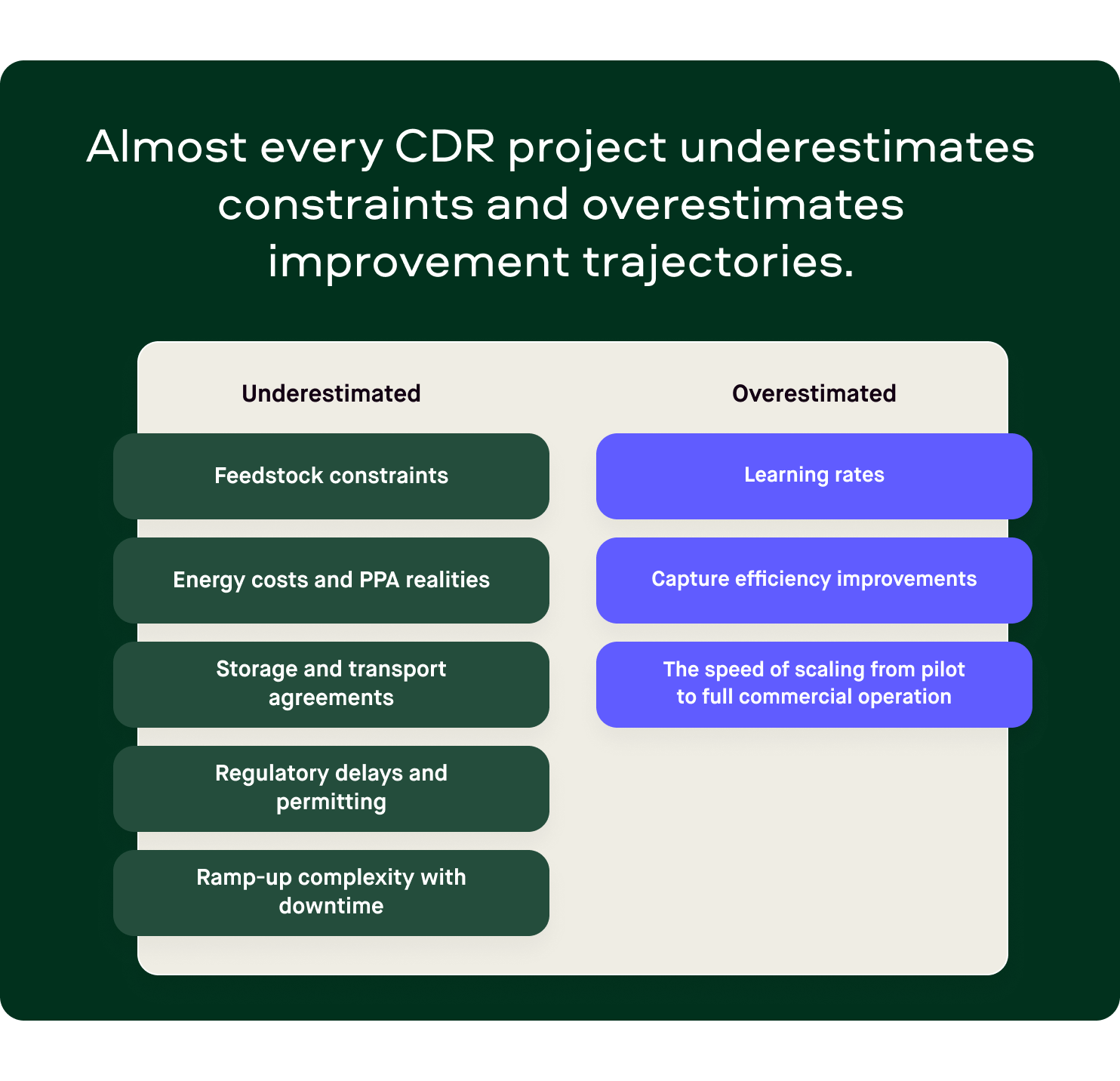 Almost every CDR project underestimates constraints and overestimates improvement trajectories. Here are a few common areas of underestimation to be aware of: