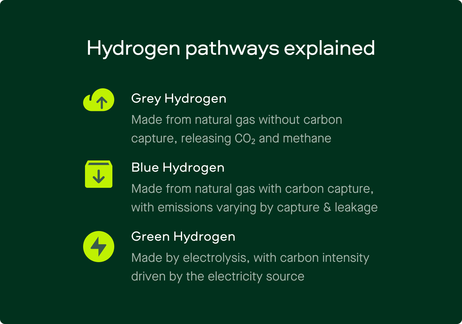 El hidrógeno verde producido utilizando capacidad renovable adicional dedicada, como energía solar o eólica verificada con una fuerte correspondencia temporal, puede alcanzar un CI muy bajo. Sin embargo, el hidrógeno verde producido utilizando electricidad de la red con una alta proporción de combustibles fósiles puede tener un CI sorprendentemente alto.