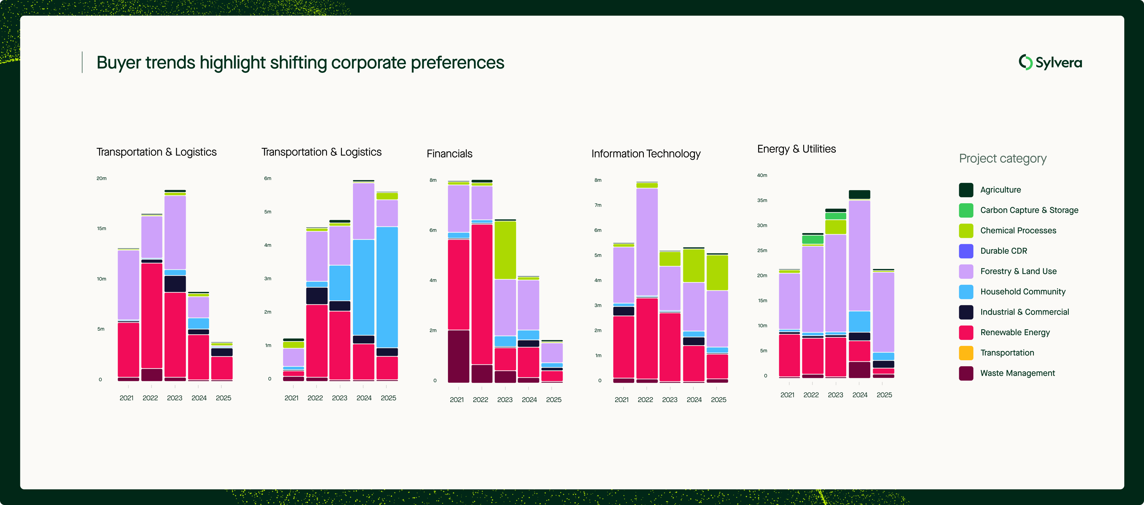 Meanwhile, Sylvera’s Buyer Directory reveals notable shifts in how different sectors approach carbon credit purchasing. Latest retirements in 2025 indicate that professional services firms accelerated their use of carbon credits from cookstove projects, which now represent around 70% of known retirements by the sector. The use of renewable energy carbon credits continued a steady decline in most sectors, and fell most significantly amongst technology, financial, and professional services firms. Transportation and logistics firms stood out as an exception to this trend, with renewable energy credits still representing 60% of their demand.