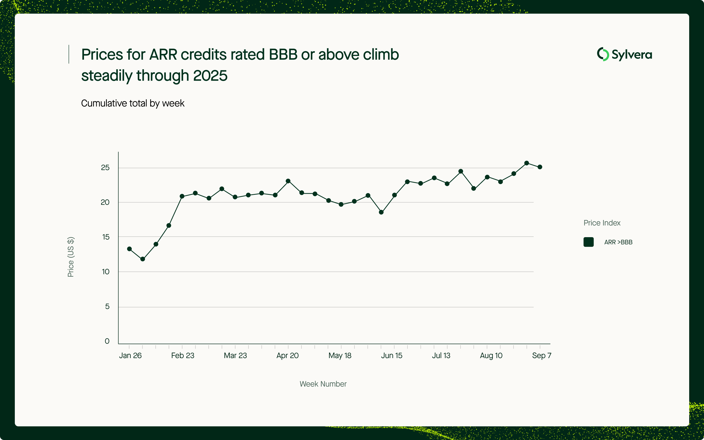 Our new Quality-Weighted Price Index reveals a clear premium emerging for higher-quality ARR (Afforestation, Reforestation and Revegetation) credits. Prices for ARR credits rated BBB or above have climbed steadily throughout 2025, reaching US$24 in September, up $10 since the start of the year.