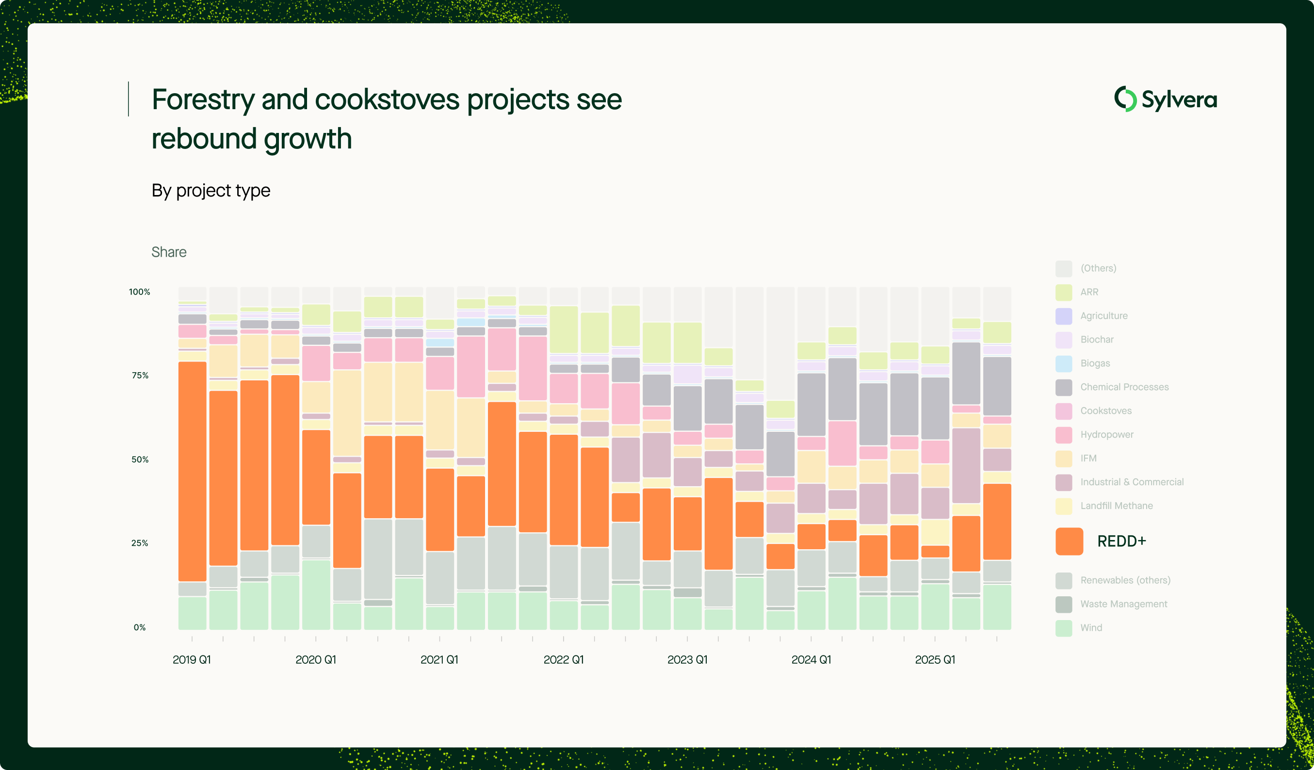 Issuances from forestry projects performed strongly in Q3. REDD+ projects saw a significant rebound in particular, making up 26.05% of issuances compared to 16% in Q2 and just 10% in Q3 last year. This suggests improving buyer trust in the project type, which has seen improvements in overall quality driven by enhanced methodologies, better monitoring, and more stringent standards addressing previous concerns around accounting and additionality.