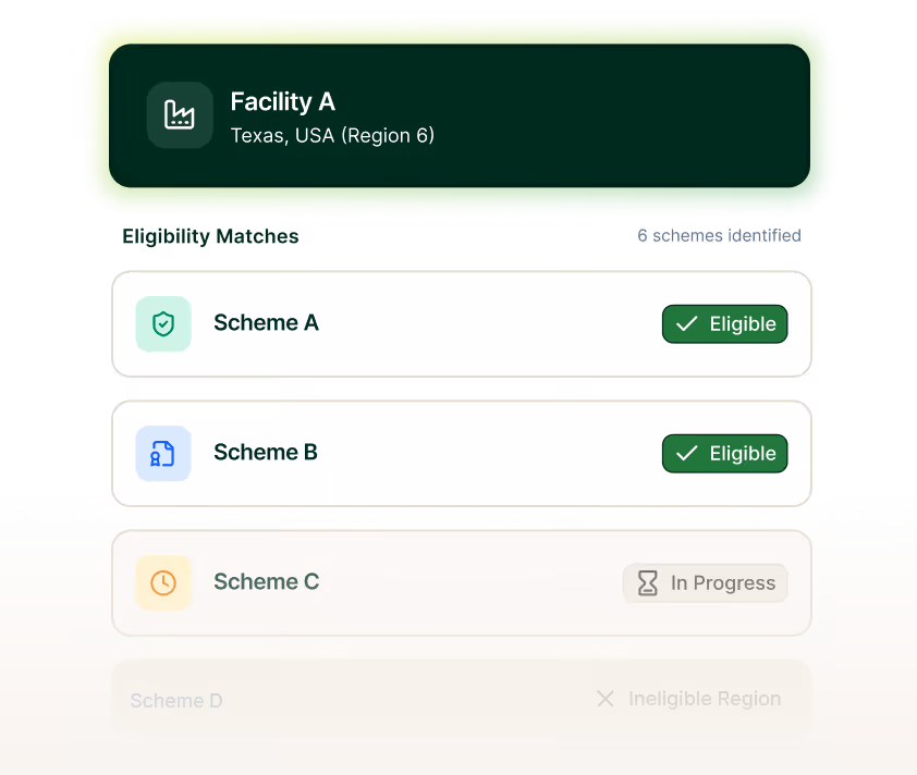 See exactly which schemes each facility or cargo qualifies for-from regulatory compliance to voluntary certification - with estimated value.