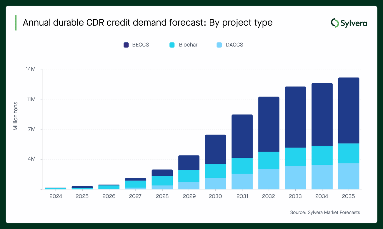As previsões de mercado Sylvera indicam que os volumes de demanda por CDR durável continuarão a crescer até 2035. Embora as compras da Microsoft representem uma grande parte dessa demanda, ainda há espaço para crescimento à medida que outros compradores entram no mercado com novas aquisições.